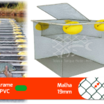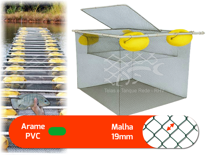 As laterais e o fundo utilizam tela tipo alambrado NBR 10.118, com arame galvanizado revestido em PVC de alta aderência, que assegura máxima durabilidade e resistência à oxidação. Acompanha comedouro interno, projetado para minimizar o desperdício de ração, e quatro flutuadores de polietileno de alta densidade anti-UV, homologados pela Marinha do Brasil.